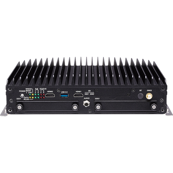 | I/O Interface-Front | 12 x LED indicators (including 3 x programmable LEDs) 2 x externally accessible SIM card slots with covers 2 x 2.5" removable SSD trays 1 x externally accessible SD card slots with covers 1 x reset button 1 x power button 1 x USB 3.0 type A (5V/0.9A) 2 x HDMI 1.4b 1 x M8 (6-pin) 2 x SMA antennas for 1 x Microphone in (mono), 1 x Line out (Stereo) |